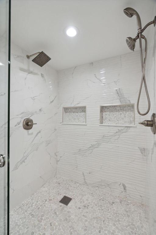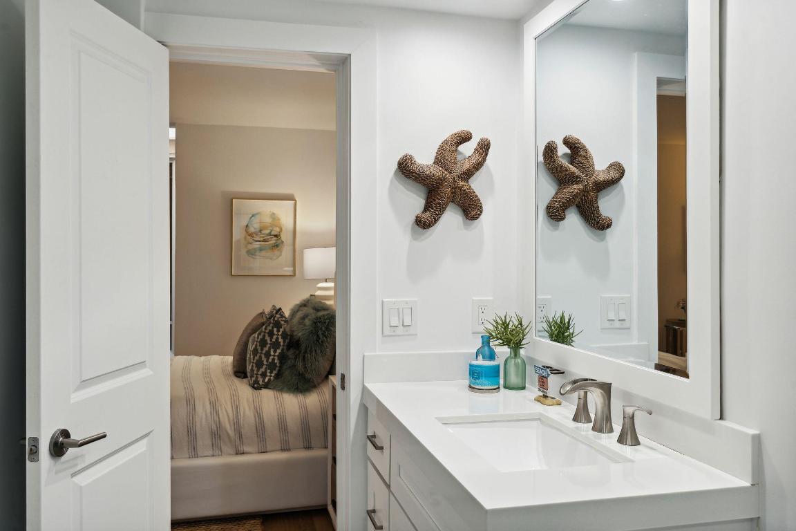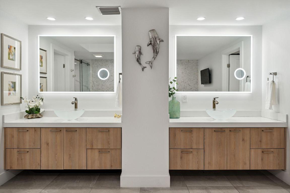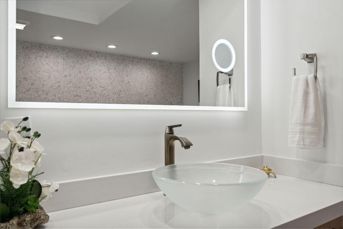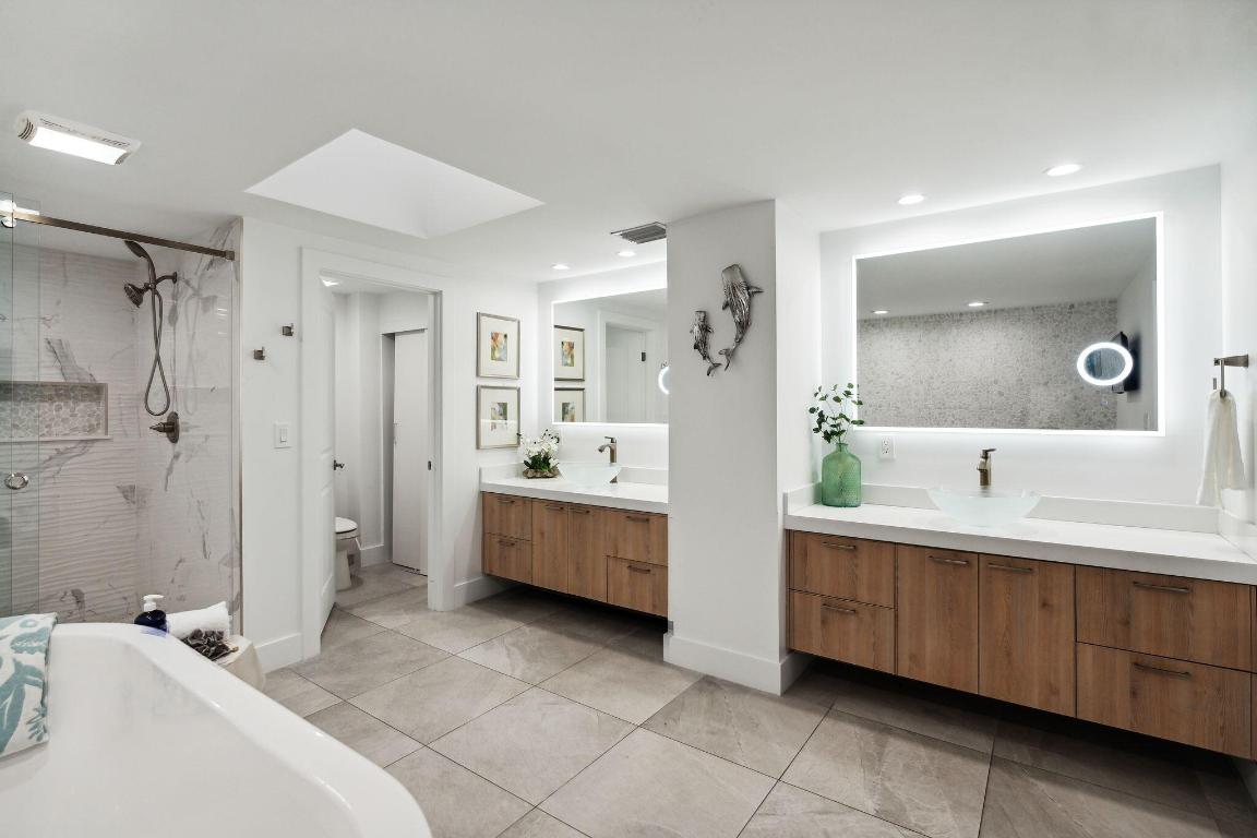 The renovated bathrooms showcase sophistication, with the master bathroom featuring his and her sinks, a luxurious free-standing tub, and a separate showera private sanctuary for a spa-like experience.
