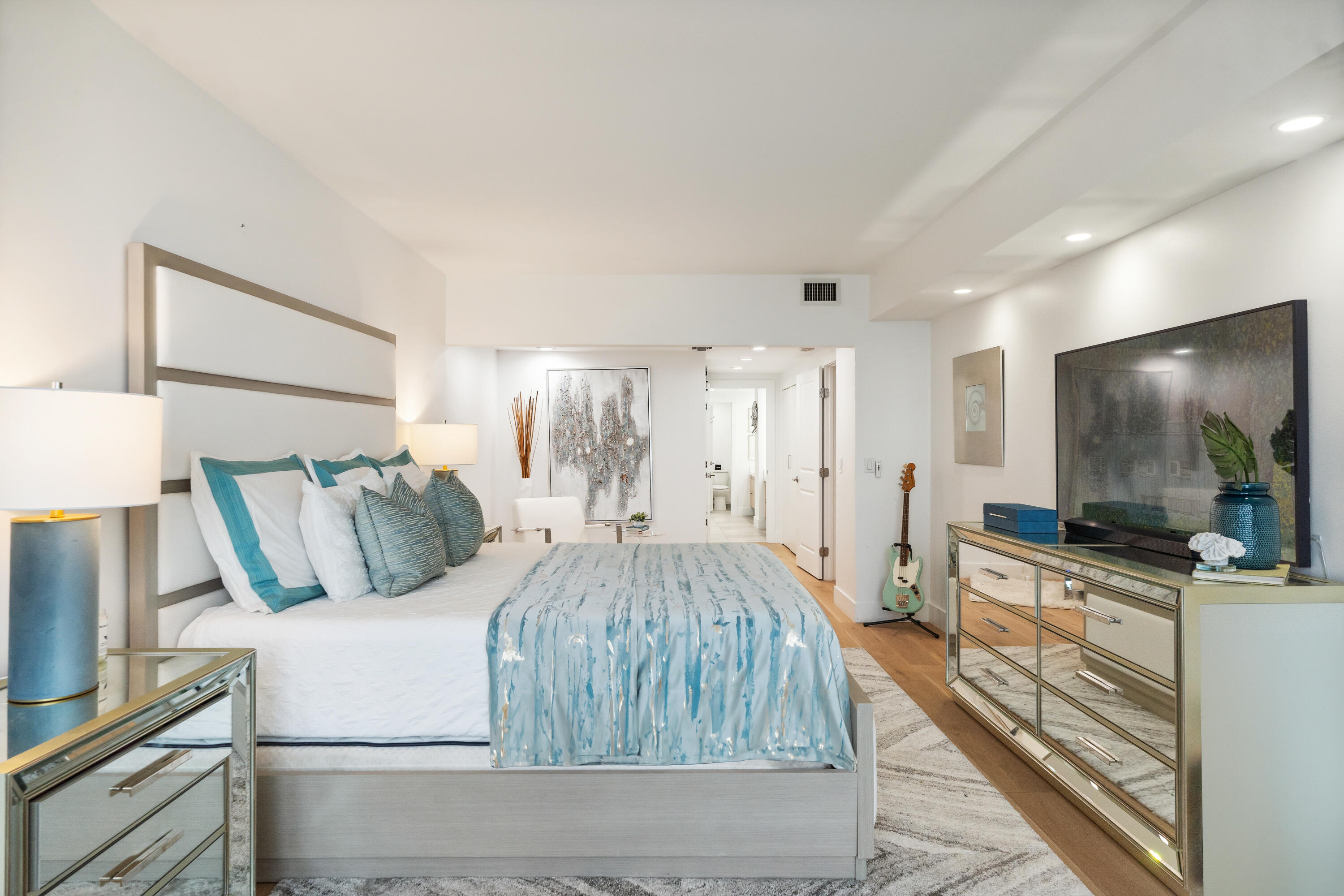 The kitchen, a haven for culinary enthusiasts, is adorned with infinity white quartzite countertops, a double wall oven, a spacious island, and a bar seating area for eight. Thoughtfully designed California closets provide ample storage, keeping your sanctuary clutter-free.