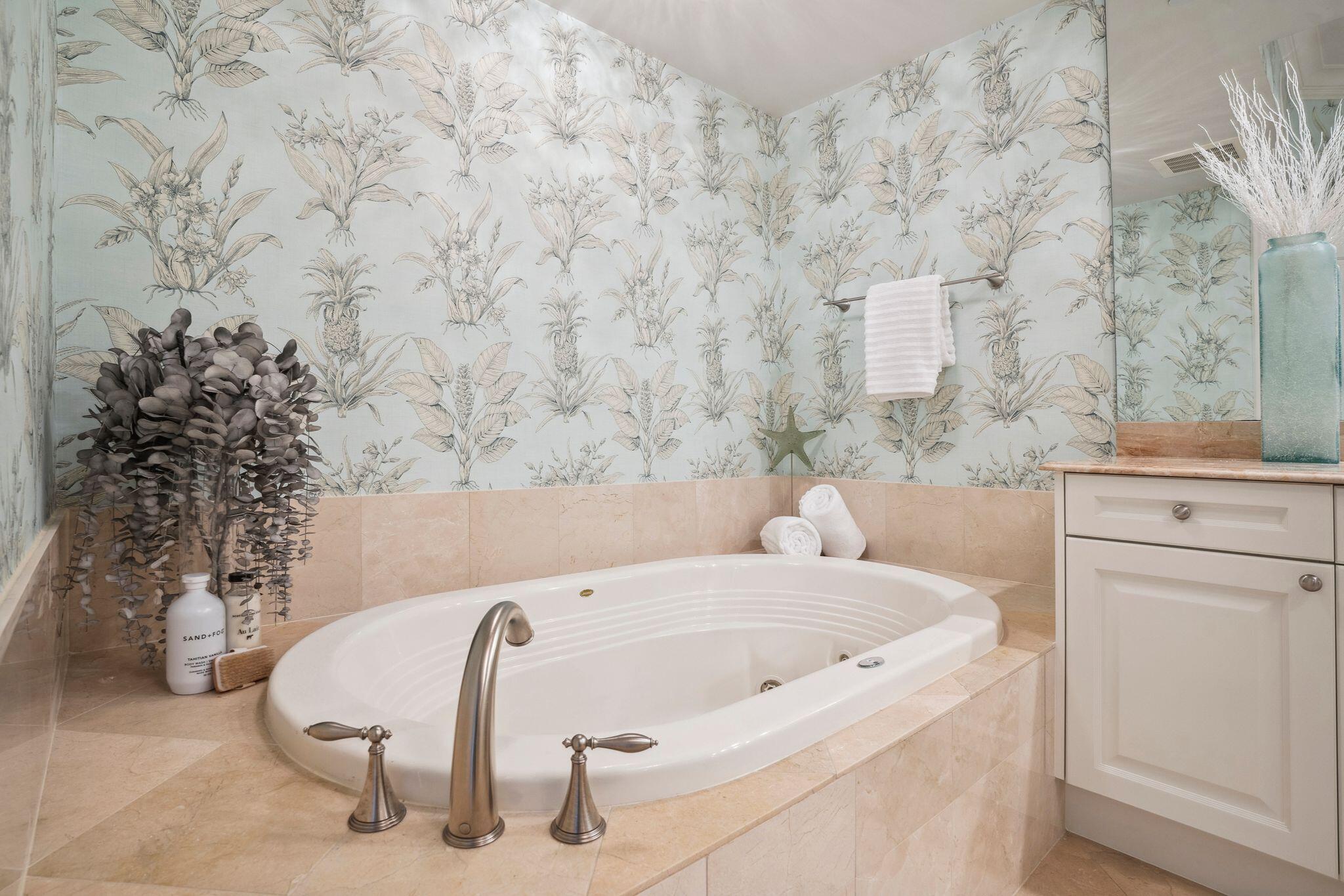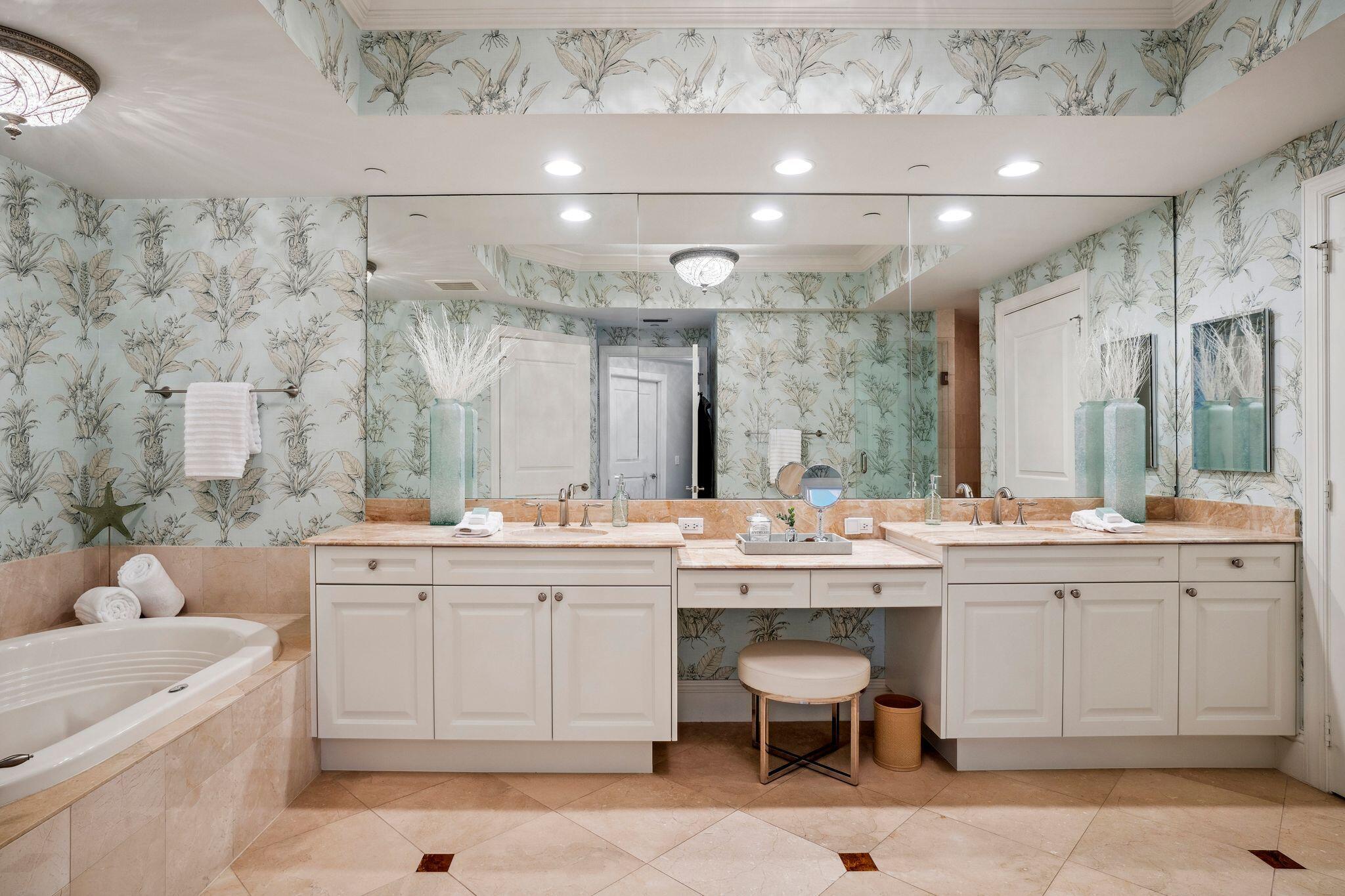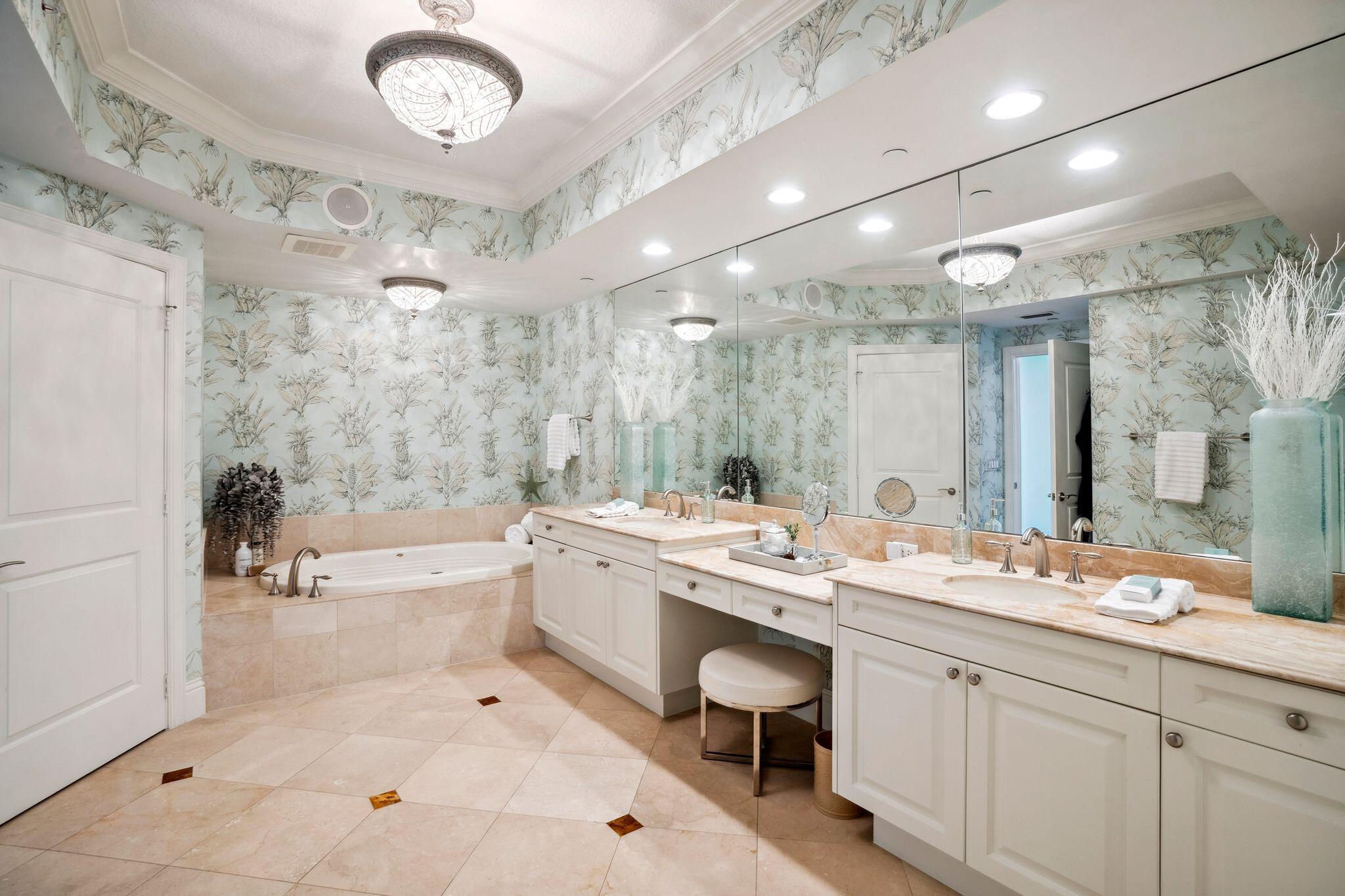 The oceanfront master suite is a private retreat with terrace access, Jacuzzi tub, his-and-hers water closets, and a seamless shower. A separate guest wing houses three additional bedrooms ( 2 of which are ensuites with private terraces) and sweeping water views. Recent upgrades include a renovated kitchen and bathrooms, electric shades, crown molding, designer lighting, and a new water heater.
