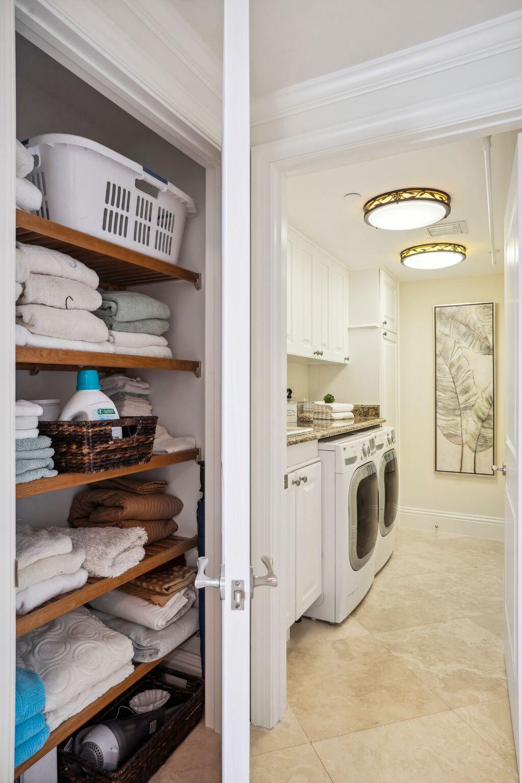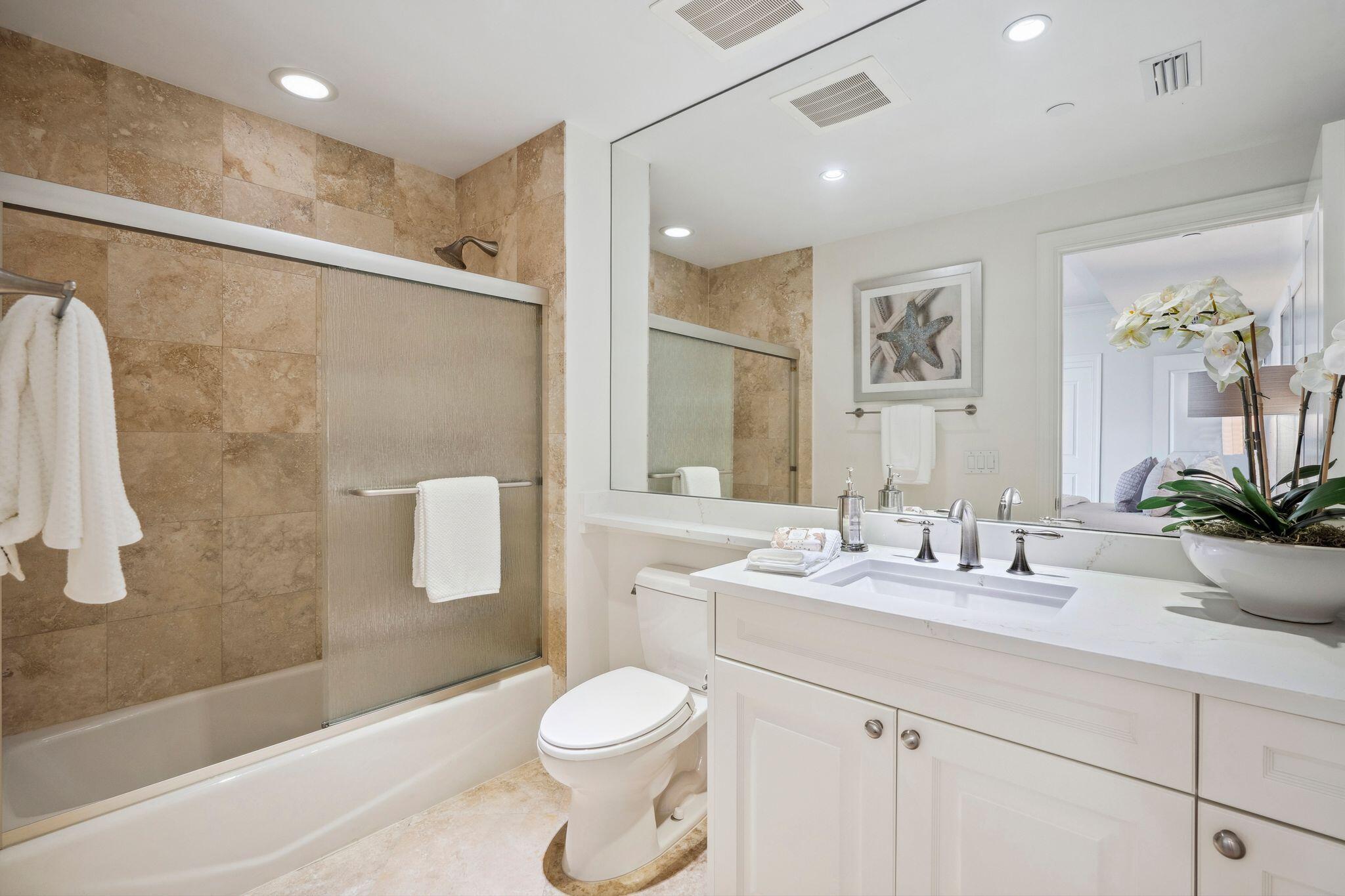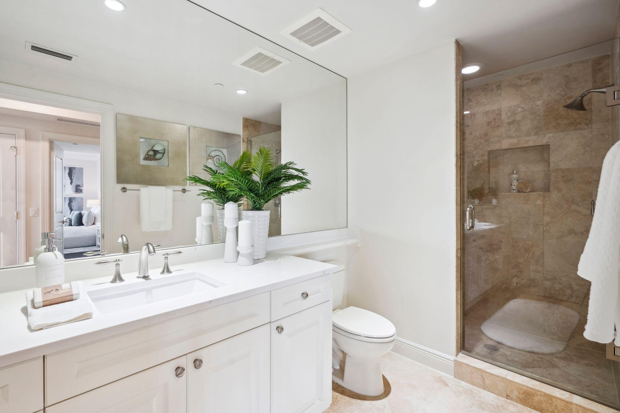 The oceanfront master suite is a private retreat with terrace access, Jacuzzi tub, his-and-hers water closets, and a seamless shower. A separate guest wing houses three additional bedrooms ( 2 of which are ensuites with private terraces) and sweeping water views. Recent upgrades include a renovated kitchen and bathrooms, electric shades, crown molding, designer lighting, and a new water heater.