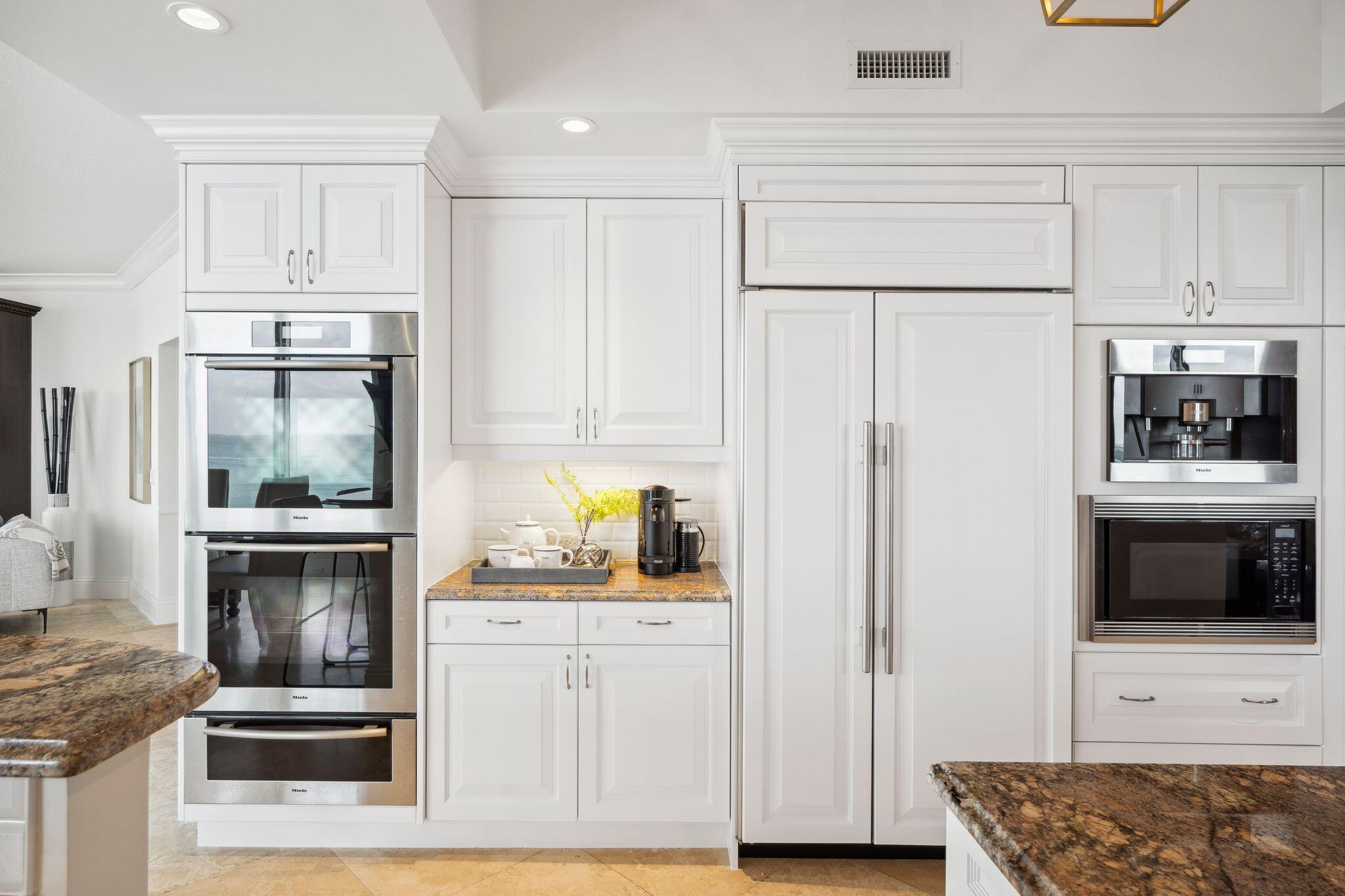 Priced Over $400K Below the Recent $3.9M Appraisal - Exceptional Opportunity in Singer Island's Premier Boutique Oceanfront Building! Step into Oceans Edge, an exclusive, manned-gated community of just 40 residences combining modern 2008 construction, strong cash reserves, an exceptionally well-managed condo association, and unmatched service. Enjoy resort-style amenities including concierge and beach service, 7-day-a-week handyman services, oceanfront heated pool with private cabanas (when available for purchase), sauna, gym, Jacuzzi hot tub, locker rooms, elegant ocean-view event room, private beach access, grilling area, movie theatre, secure garage parking, and private climate-controlled storage. Within this exceptional setting, Residence 701 offers one of the building's most desirable and rarely available floor plansspanning over 3,800 square feet from ocean to Intracoastal with water views from almost every room. This north-end corner unit captures golden sunrises over the Atlantic from its direct oceanfront terrace and spectacular sunsets over the Intracoastal from its west-facing balcony. The open-concept living and dining spaces flow seamlessly into a fully renovated chef's kitchen with Wolf gas cooktop and pot filler, Miele and Sub-Zero appliances, and sleek contemporary finishes.
